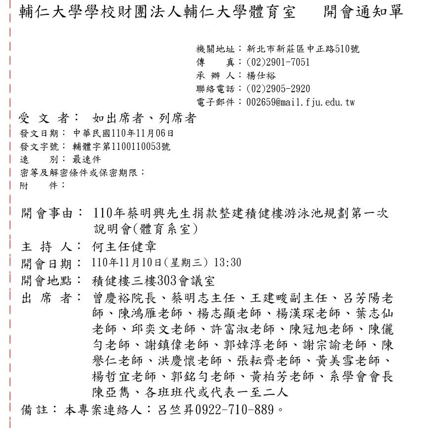 NEW!!110年蔡明興先生捐款整建積健樓游泳池規劃第一次說明會(體育系室) 2021-11-09• 最新消息 NEW!!110年蔡明興先生捐款整建積健樓游泳池規劃第一次說明會(體育系室) 附件下載 1.jpg
